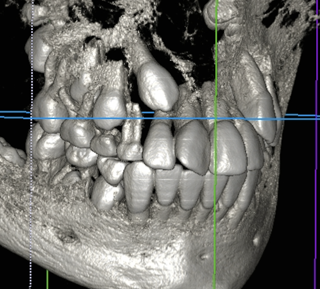 本来の場所ではなく内側に傾いていて、隣の歯の根に当たり始めています。