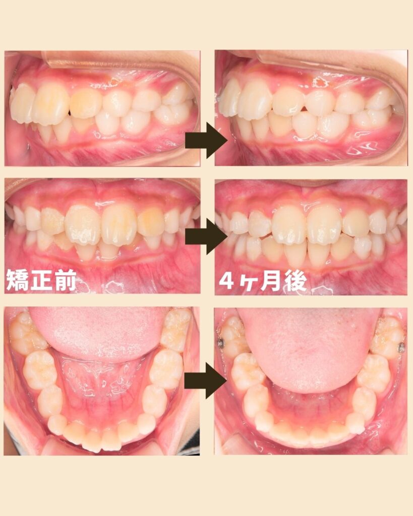 成長を活かした小児用マウスピース矯正を行い、4ヶ月の時点で咬み合わせや歯並びに変化が見られています。小児用マウスピースは、成長のタイミングによってはワイヤー矯正と比べて比較的早く歯並びが整っていくケースもあります。