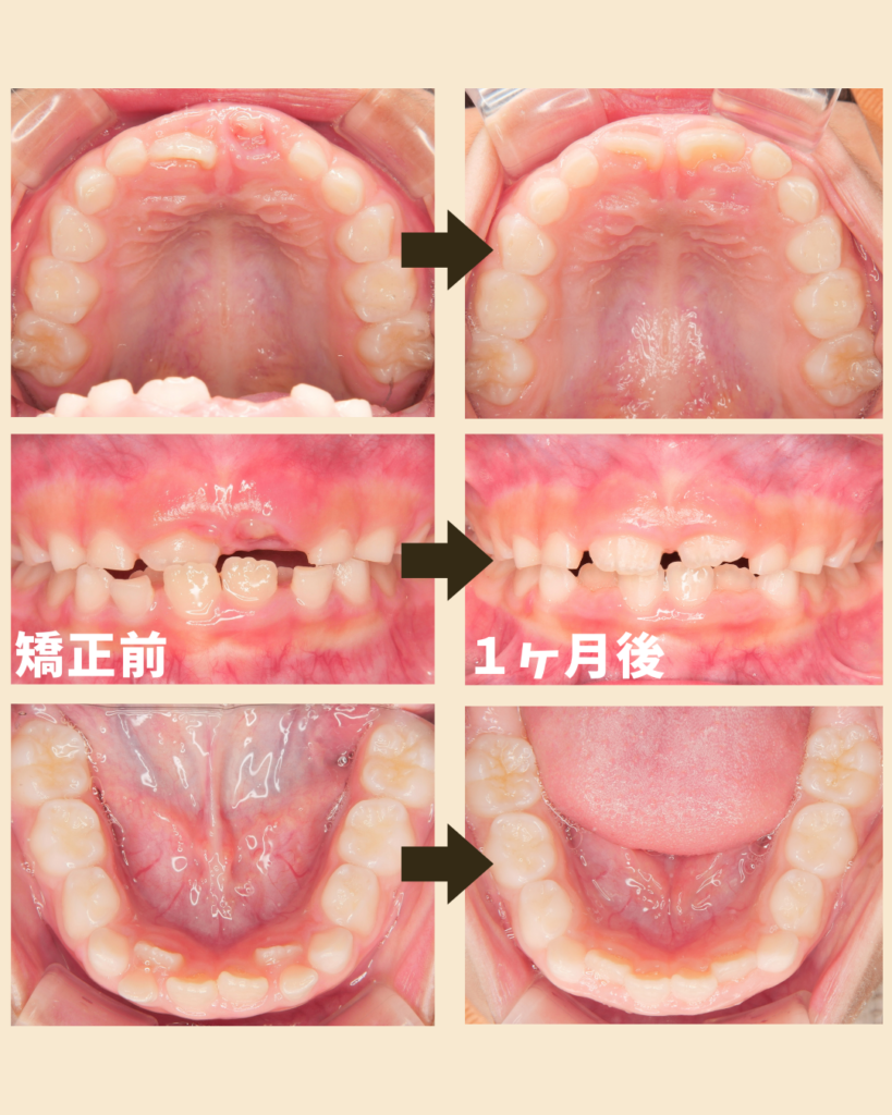 開始から1か月で前歯の反対咬合に変化が見られ、今後は全体の歯並びを整えていく予定です。