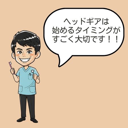 などを総合的に判断して、開始時期が決定されます。そのため、同じ8歳でも「すぐにヘッドギアが必要な子」と「経過観察でよい子」が分かれることがあります。