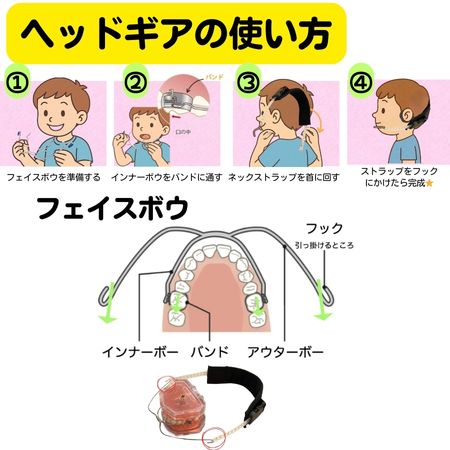 次に重要なのが、着脱は必ず保護者の方が確認することです。慣れてくるとお子さん一人で装着できるようになりますが、フェイスボウの向きがずれていたり、ゴムの力が左右で不均等になっていたりすると、十分な効果が得られないことがあります。特に治療初期は、毎回正しく装着できているかを一緒に確認すると安心です。