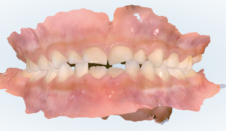 前から見てみると、下の前歯のところにガタガタが出てきていますね。上も少しガタつく可能性はありますが、現時点では下の方が強くガタつきが出ています。