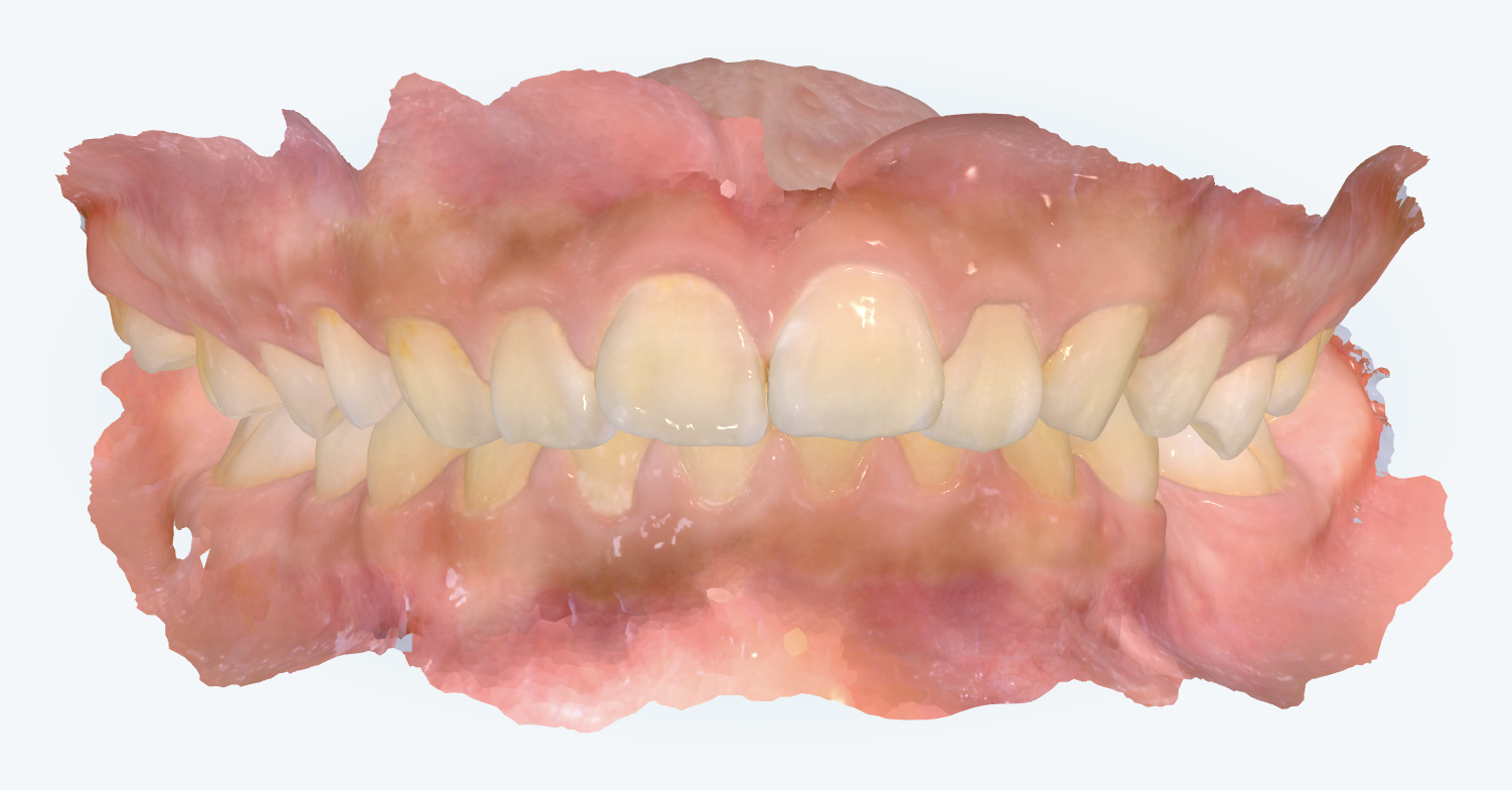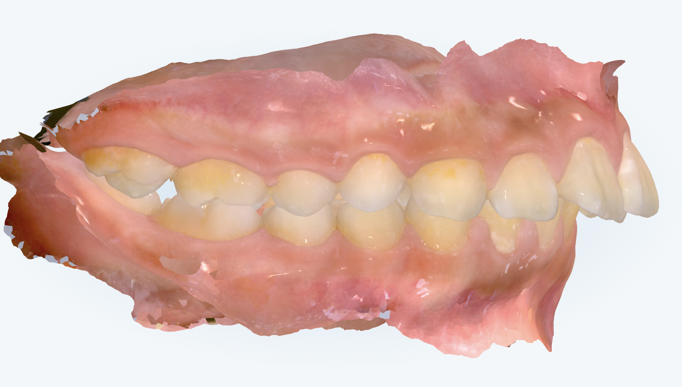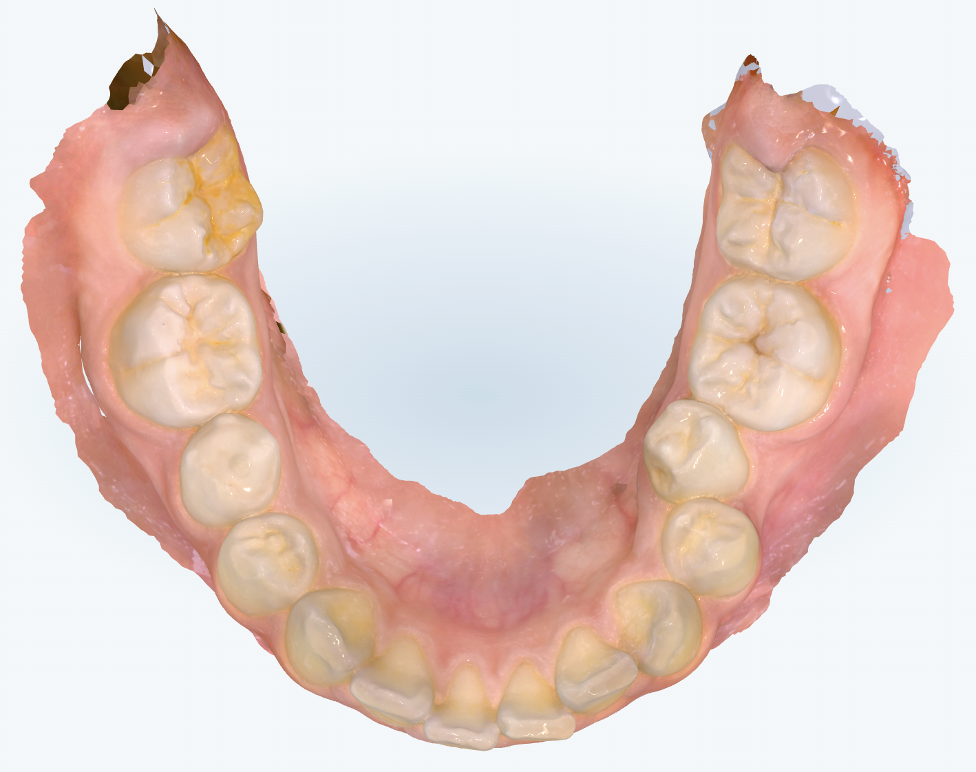 まず歯並びを見ると、下の歯が何本か内側に入っていて上下の歯で噛めていないところがあります。ここは歯の傾きを変えて上下で歯を噛ませてあげたほうがいいです。
